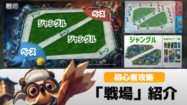 戦場は、各チームの心臓部『ベース』が置かれたベースエリア、ベースへの進行を阻止する『タワー』が置かれた3本のレーン、様々な『クリープ』が潜んでいるジャングルの3つのエリアで構成されており